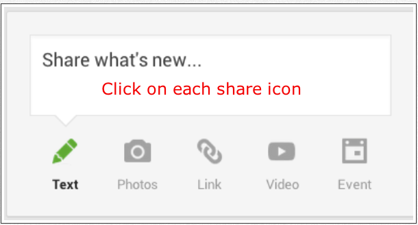 You have the ability to share Text, Photos, Links, add a video and even setup meetings or Video Hangouts by clicking on Event. Click on each share icon to see what options they have. Everything can be done within the community – I can’t stress that enough.